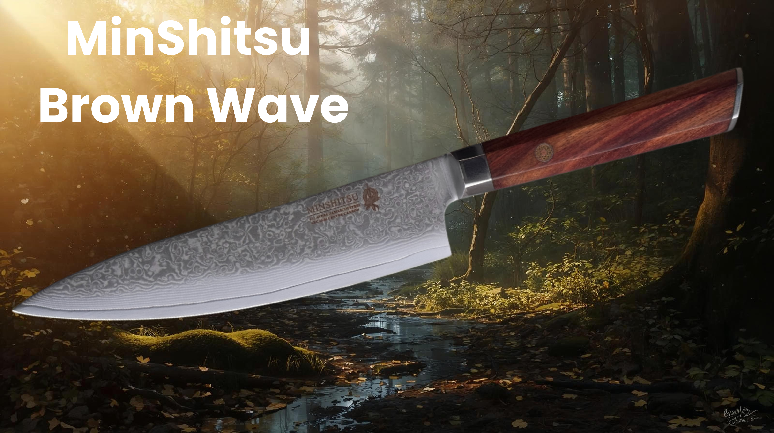 MinShitsu Premium Brown Wave, 20 cm blad og 200 g, kombinerer elegant 8-kantet tre håndtak med presis ytelse. Et funksjonelt smykke som løfter kjøkken opplevelsen.