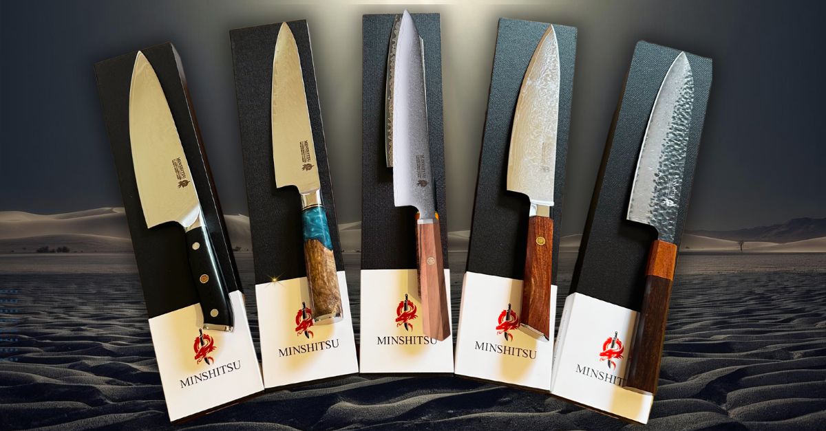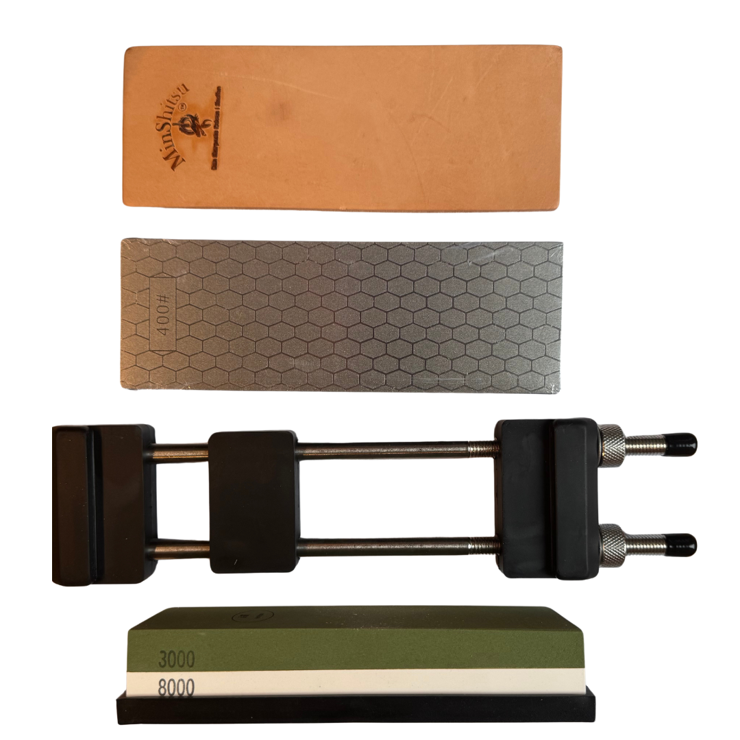 MinShitsu kombinasjonssett kombinerer diamantstein (400/1000 grit) for grovsliping med aluminiumoksid for finere sliping, avsluttet med lær for polering. For maksimal skarphet kan 3k eller 8k slipesteiner brukes til siste finish, og gir presise, sylskarpe kniver hver gang