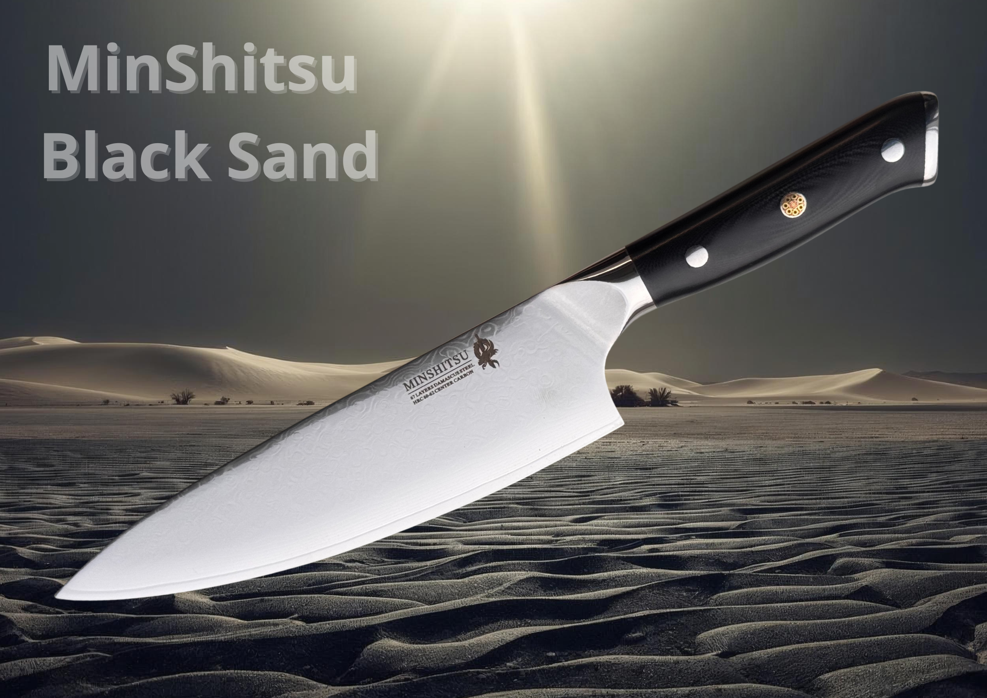 MinShitsu Black Sand Premium – 20 cm blad, 262 g. Sylskarp og balansert kniv som takler alt fra grønnsaker til kjøtt, gjør kjøkkenarbeidet enklere og mer effektivt.