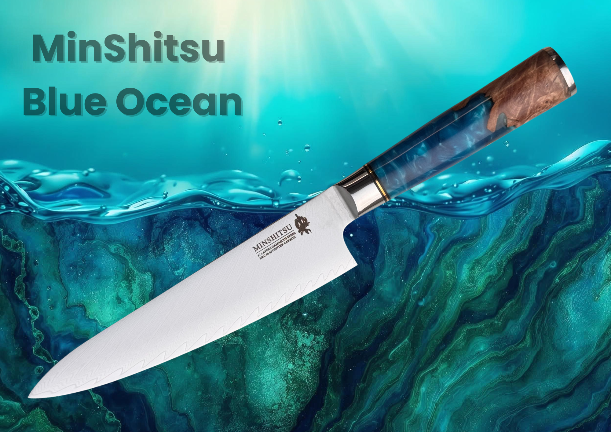 MinShitsu Premium Blue Ocean er en presis og allsidig kokkekniv, perfekt for hakking, skjæring og kutting. Balansert design gir kontroll, effektivitet og komfort i kjøkkenarbeidet.
